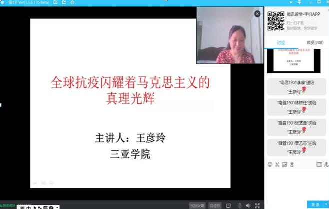 4月27日,bb贝博艾弗森官方网站教授王彦玲在腾讯课堂直播平台,结合全球抗疫情况做了关于《全球抗疫闪耀着马克思主义的真理光辉》的讲座,358人通过线上参加此次讲座。此次讲座王老师讲了新冠病毒肺炎全球大流行,危及人类生命健康,人类要彻底摆脱危机,必须思考人与自然、人与人等深层次的问题,全球抗疫的点点滴滴都闪耀着马克思主义存在论、实践论、社会历史观的光辉。