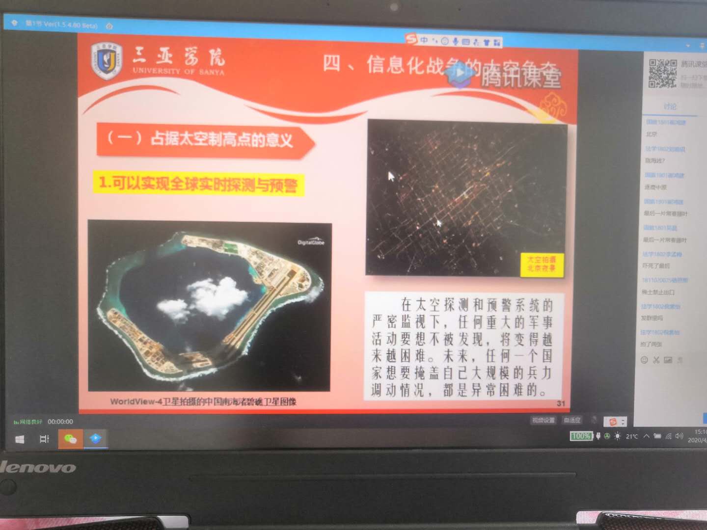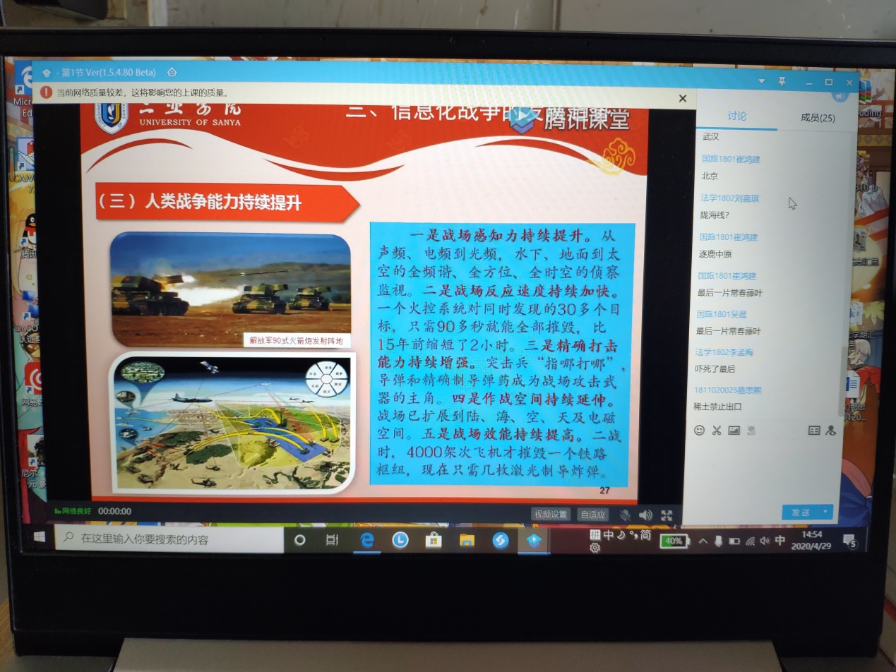 同学们认真听讲,并通过在腾讯课堂侧栏发送信息与讲座人积极互动。于世高博士也及时地回复了同学们的疑问,学习氛围非常融洽。通过学习,聆听讲座的同学们开阔了视野,对信息化战争知识有了较为清晰的认识,特别是对于中国的信息化战争能力有了一定的了解,增强了对中国军事力量保家卫国的信心,提高了拥军爱军参军的热情。