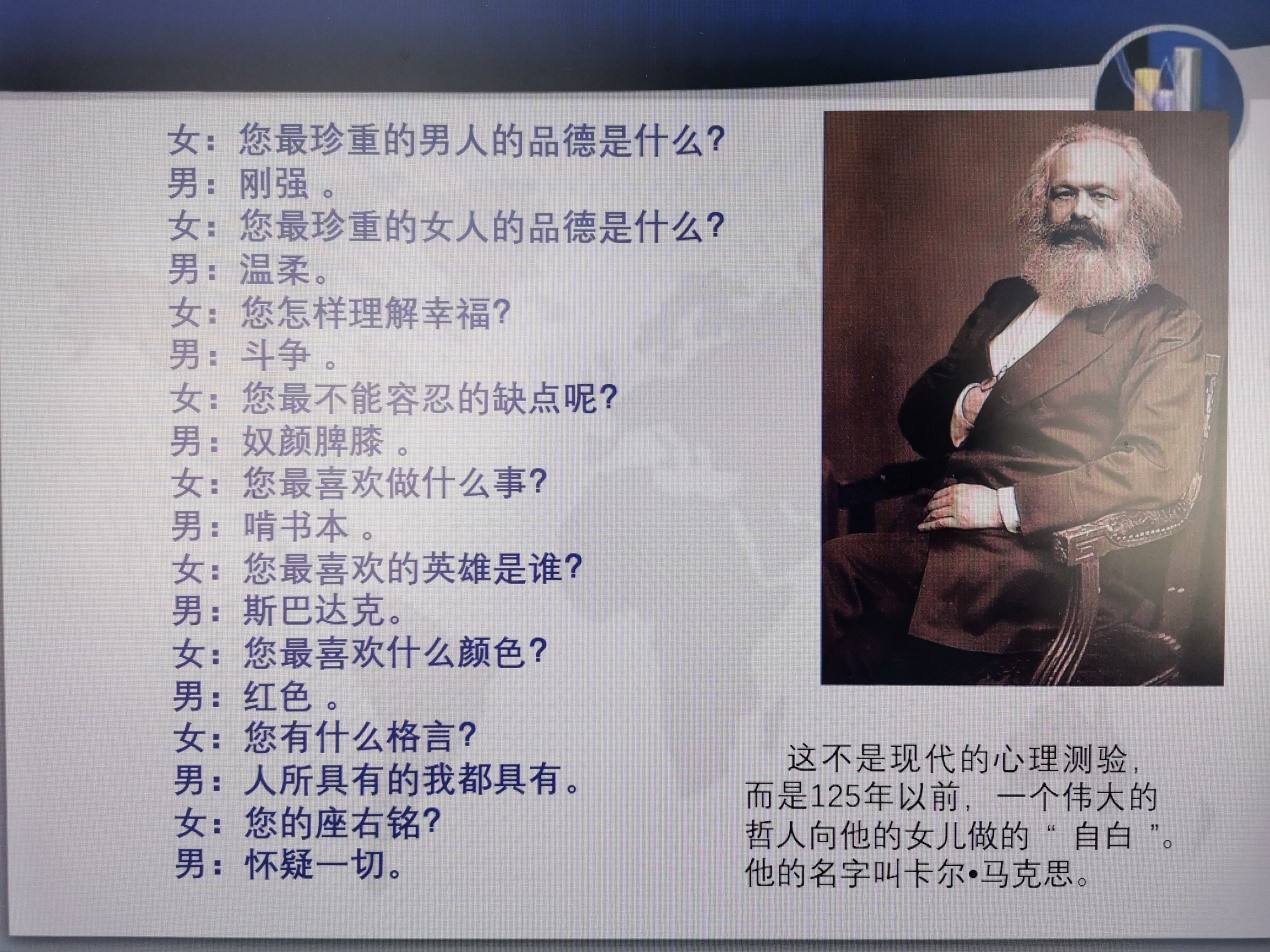 员工们也产生了共鸣:觉得伟人离我们并不遥远。马克思的博学、勤奋、为人类幸福而工作的信仰,深深地感动着他们。王老师又引用了黑格尔的名言: