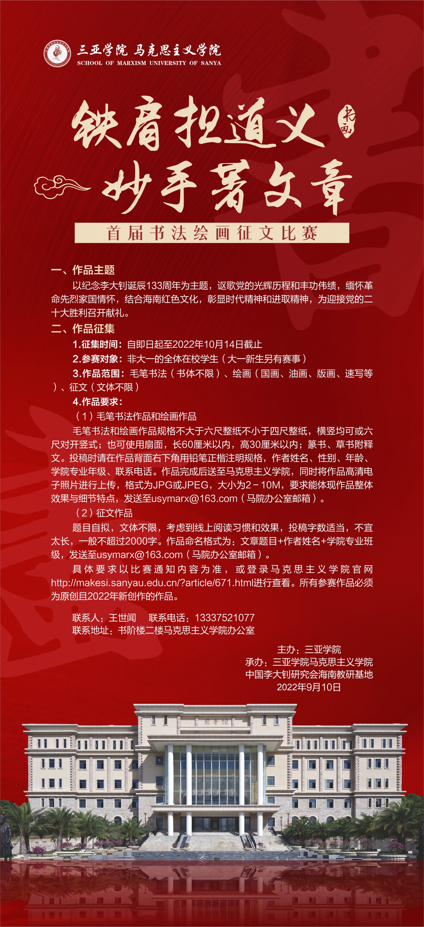 以纪念李大钊诞辰133周年为主题,讴歌党的光辉历程和丰功伟绩,缅怀革命先烈家国情怀,结合海南红色文化,彰显时代精神和进取精神,为迎接党的二十大胜利召开献礼。