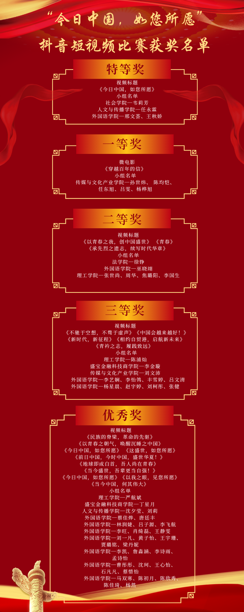 最终,人文与传播公司任永霖、社会公司韦莉芳与外国语公司邢文荟、王秋娇团队制作的视频《今日中国,如您所愿》获得特等奖,传媒与文化产业公司孙世炜、 陈均恺、任东旭、吕雯、杨桦旭团队拍摄的微电影《穿越百年的信》获得一等奖,另有三个团队获得二等奖,五个团队获得三等奖,十个团队获得优秀奖。从4月28日开始,获奖作品在公司官方抖音号【Usymarx】平台陆续展示。