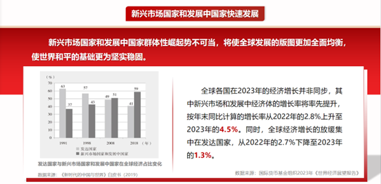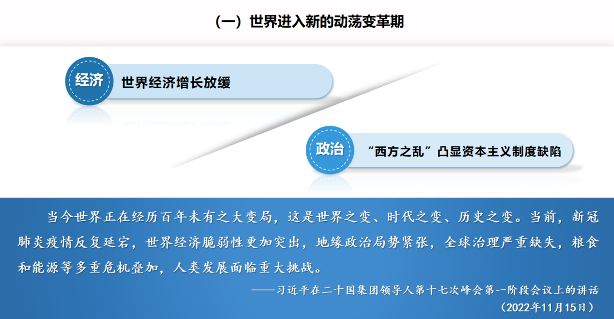 首先,段教授从世界进入新的动荡变革期、国际力量对比发生深刻变化、经济全球化遭遇逆流、国际体系和国际秩序深度调整等方面深刻阐述了百年未有之大变局的深层次原因。她从世界经济增长放缓和“西方之乱”凸显资本主义制度缺陷两个表征谈到了世界进入新的动荡变革期。