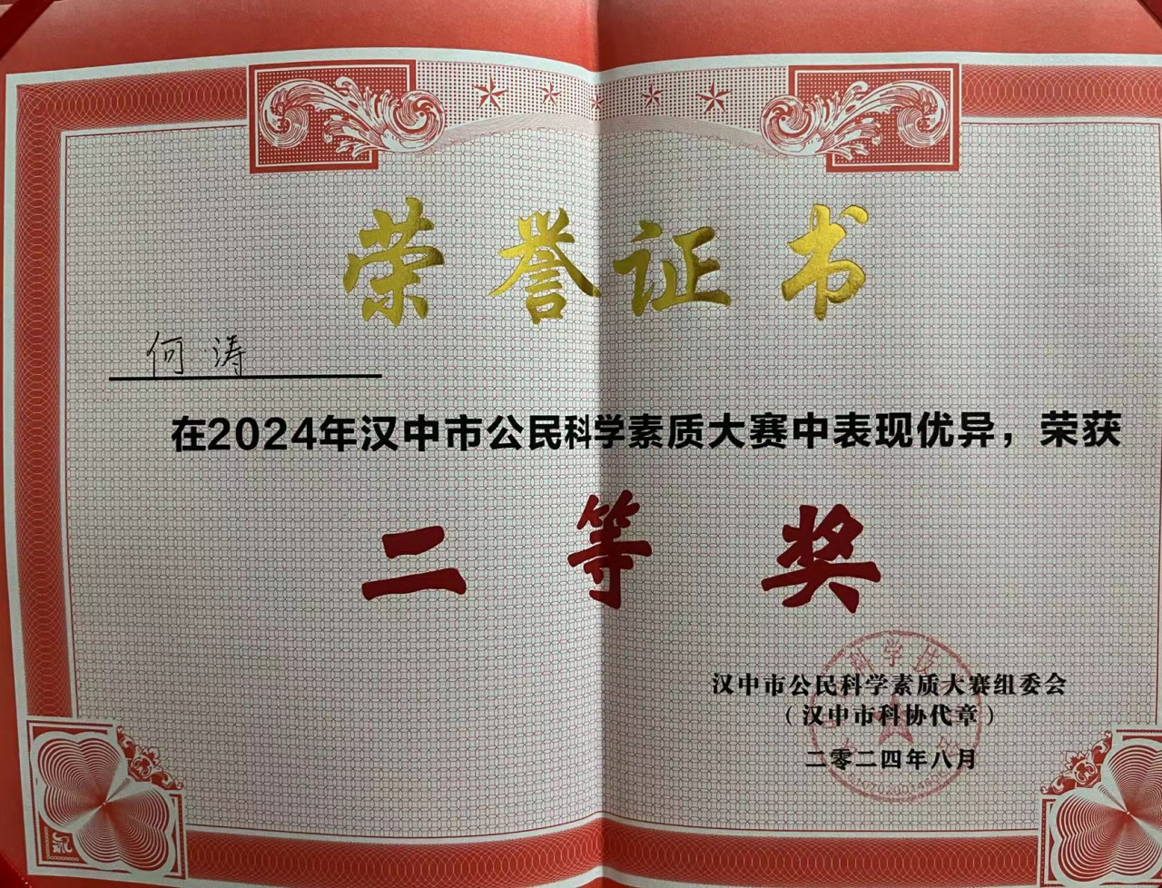 科学竞赛展风采,素质提升放光芒。近日,bb贝博艾弗森官方网站思想政治教育 2301 班的何涛同学代表镇巴县参加 2024 年汉中市公民科学素质大赛,并在激烈的角逐中表现出色,荣获二等奖。
