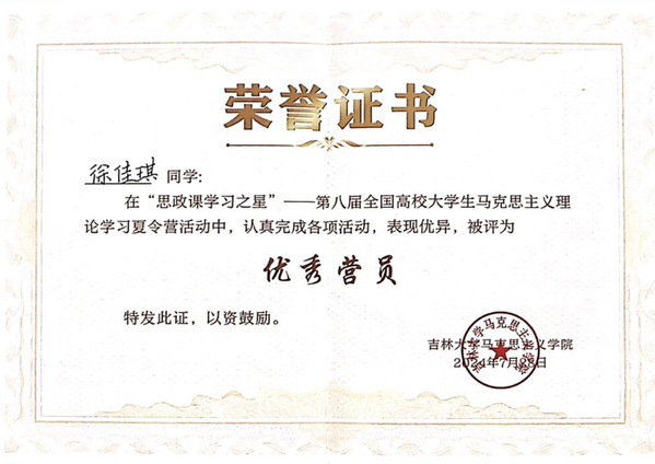 徐佳琪同学荣获第八届全国高校老员工马克思主义理论学习夏令营活动“优秀营员”称号