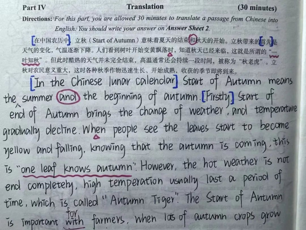 在备考过程中,一是扩大词汇量,通过阅读和背诵积累词汇;二是加强语法和句型的学习,确保表达准确;最重要是反复的练习,在做真题中反思自己在翻译过程中的错误和不足,总结适用于自己的翻译技巧与方法。同时,在备考的过程中要保持积极的心态和拥有能够坚持下去的心。