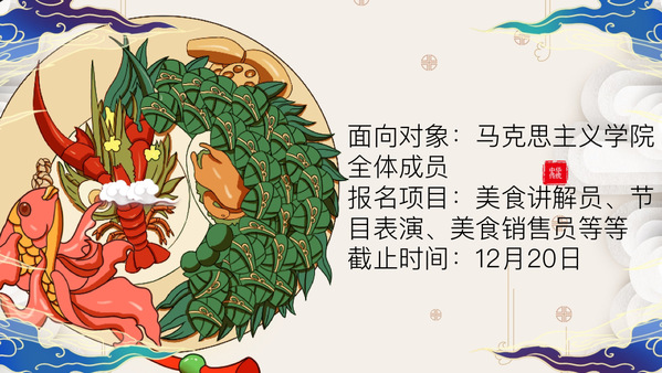 【如何加入】报名方式:扫码进群,在群里修改自己想要报名的组别,报名时间截止到12月20号晚八点;美食讲解员、节目、美食售卖员报名截止时间:12月21号下午两点。