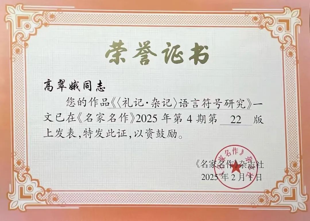 据悉,2025年3月8日公司学术委会主任王宏海教授指导的海南省国家级老员工创新创业训练计划项目《<礼记·杂记>语言符号研究》(项目编号:202313892019)获得突破性进展,该项目主持人高翠娥同学已经收到《名家名作》杂志社“研究”专栏寄来的《<礼记·杂记>语言符号研究》样刊以及荣誉证书。