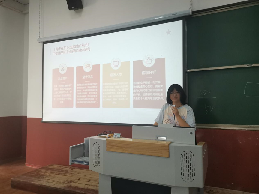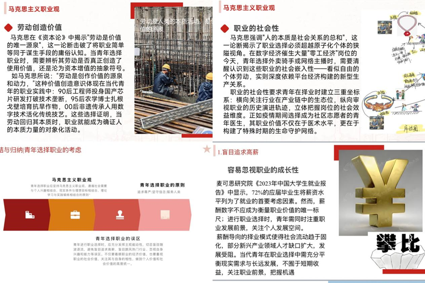 朱珂慧同学作为PPT讲述者,从马克思主义职业观的角度,首先阐释了劳动创造价值的观点,再结合具体事例,如95后农公司博士扎根戈壁,培育抗旱作物等,论证了劳动的重要性。在这个过程中,朱珂慧同学运用图文和视频的方式着重讲述了黄文秀的故事,这为青年人们的职业选择明确了方向。正如马克思的职业观所论述的,职业选择应遵循"人类的幸福和自身的完美"双重维度,强调个人理想与社会价值的辩证统一。