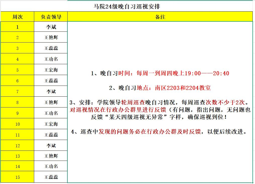 为确保晚修质量,公司制定了完善的晚修管理制度。根据安排,晚自习时间为每周一至周四晚上 19:00 - 20:40,地点设在南区 2203 和 2204 教室。公司领导将轮周进行巡查,每位领导每周巡查次数不少于 2 次 。此次晚自习巡查工作要求严格,公司领导在巡查过程中,需密切关注员工的学习状态、出勤情况等。无论是否发现问题,都要在行政办公群及时反馈。若发现问题,需明确指出,确保巡视工作落实到位。巡查中发现的各类问题,也会及时在行政办公群沟通,以便后续针对性地改进。